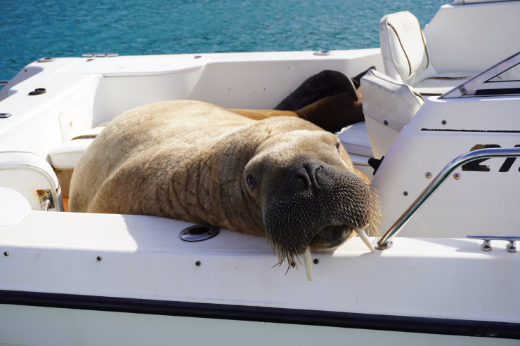 Для неповоротливых и неуклюжих моржей, традиционно обитающих в арктических водах и привыкших отдыхать на льдинах, длительные путешествия весьма утомительны. TengriMIX расскажет, как морж-путешественник забрел в новое для себя место и нашел для привала "айсберг" в виде лодки.