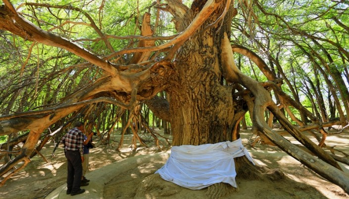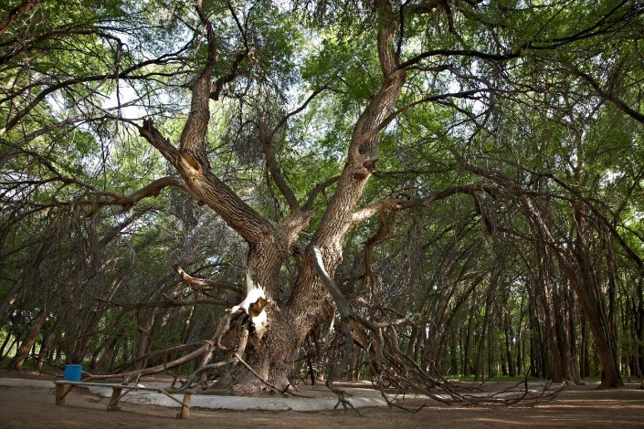 700-летний карагач недалеко от Жаркента в Алматинской области. Поскольку дерево считается священным, любой желающий может загадать желание, прижавшись к могучему стволу и привязав платочек к опустившимся под тяжестью времени ветвям. Размер платочков прямо пропорционален масштабам желания: ветви украшены ленточками, платками и порой даже простыней.