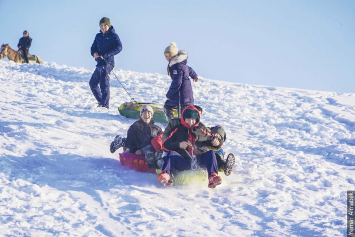 Чаще жизнь кипит у склонов, где местные устраивают горки и раскатывают их до ледяной дорожки. За тем, как катаются местные жители, интересно наблюдать. Посмотрите на их лайфхаки: надул резиновый круг для плавания, прицепил к нему веревку - и скоростные сани готовы.