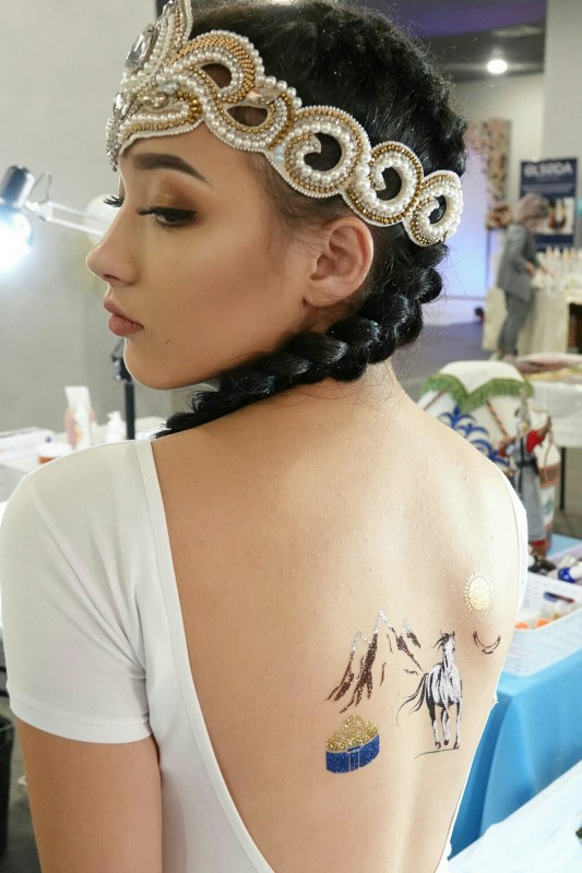 "Я окружила себя национальными атрибутами, одела модель в орнаментальном стиле и сделала все в голубых и золотых цветах. На спине у своей девушки я нарисовала жайляу - казахскую степь. Основные сложности были у меня с лошадкой, потому что если бы я не забила внутреннюю часть серебром, работа казалась бы простой", - поделилась Еркемай.