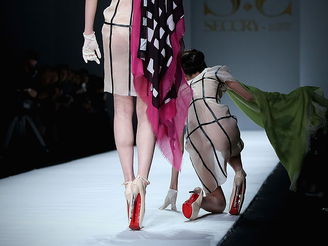 Модели, вынужденные демонстрировать наряды, дефилируя на очень высоких каблуках, не устояли во время прохода по подиуму.
