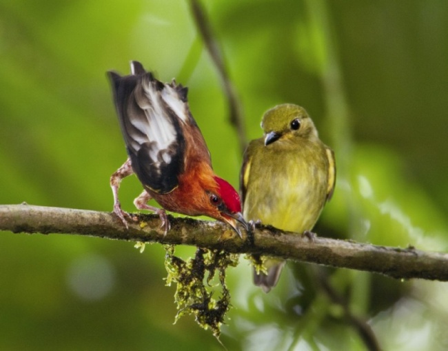 Чтобы завоевать сердце партнерши, у манакинов в ход идут все умения. Он демонстрирует ей все таланты: эффектные бросок и стойку, неподражаемый поворот на 180°. И как главное оружие - фирменная "лунная походка" в духе Майкла Джексона. Пока потрясенная партнерша приходит в себя от восторга, манакин исполняет мелодию с помощью щелчков крыльями. И делает это с огромной скоростью - в 30 раз быстрее обычной видеозаписи.