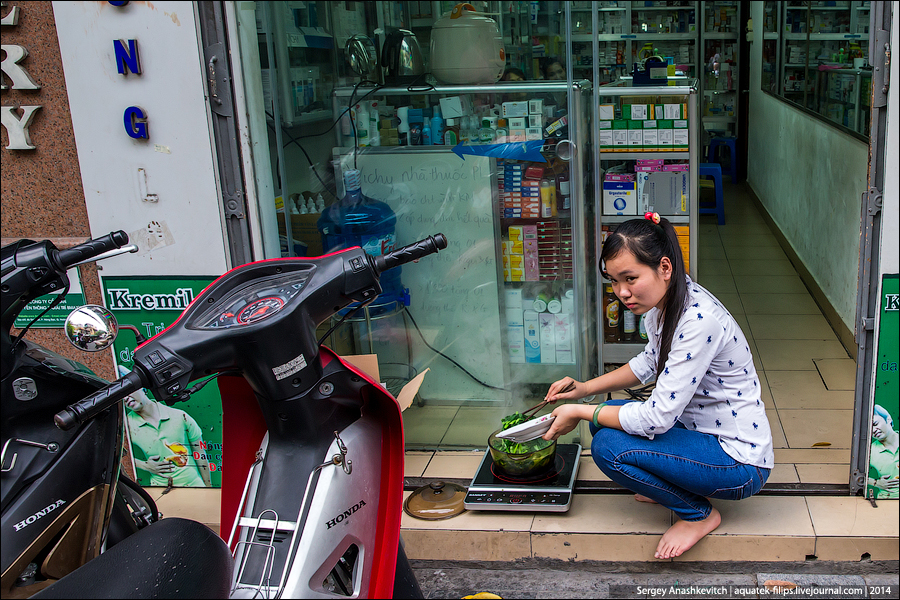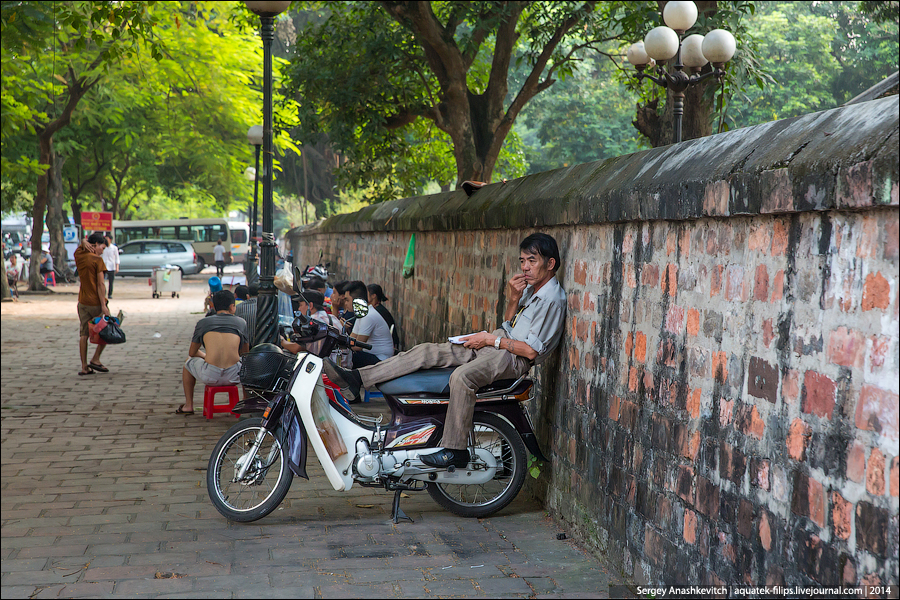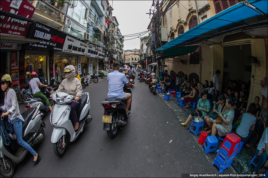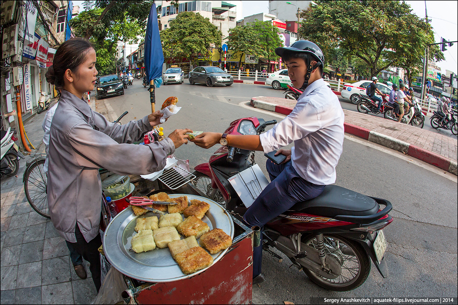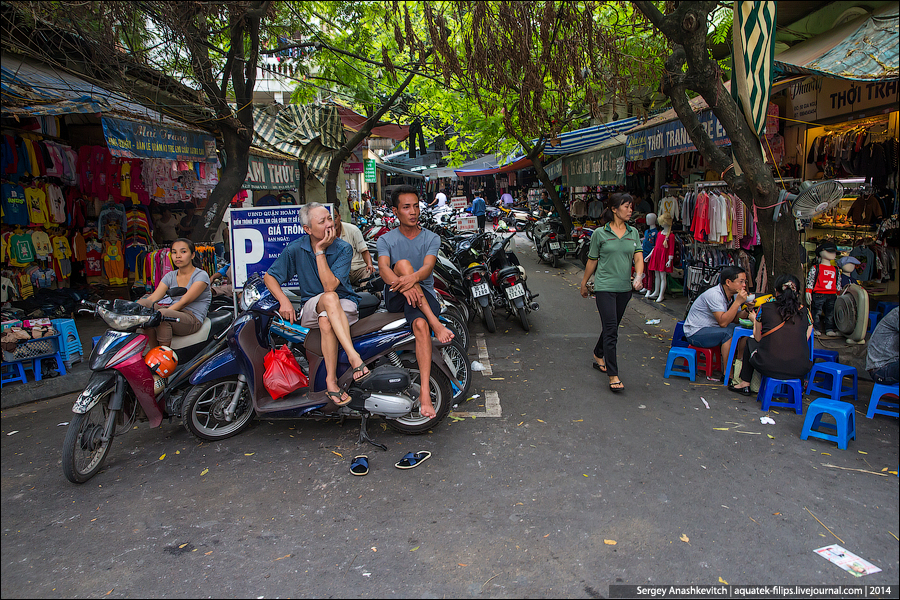 Обычная улица в центре вьетнамской столицы, обычные люди в своей обычной каждодневной суете. И эта суета для каждого своя. Кто-то развешивает футболки и рубашки в торговых палатках, кто-то суетливо готовит блюда в уличном фастфуде, кто-то спешит с корзинами фруктов в поисках покупателя, а кто-то сидит на своем мотобайке в ожидании клиента, чтобы подвезти.