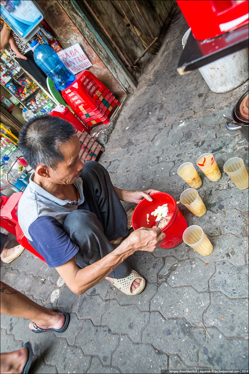Наступает вечер. Это время, когда закрывается большая часть торговых лавок и открываются закусочные - все начинают есть на улицах. Готовят просто на коленках.