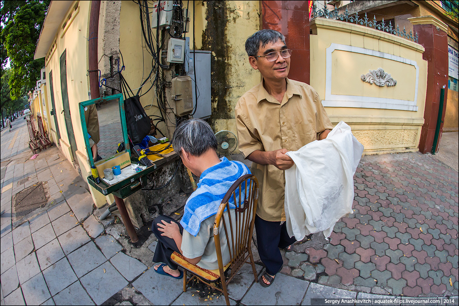В Ханое просто огромное количество вот таких уличных цирюлен. Кстати, в них не только стригут, но и могут побрить бороду.