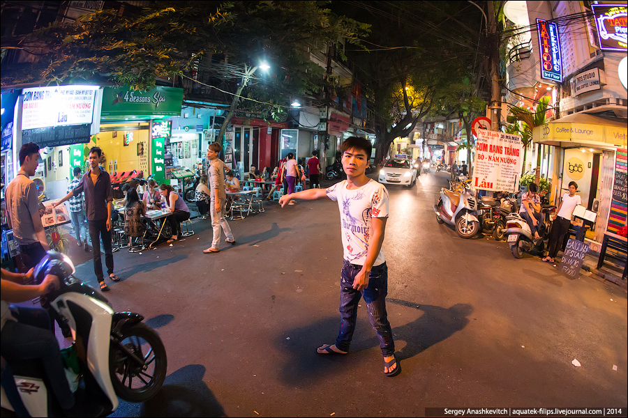 Уличных кафе так много, что кажется, будто одна половина вьетнамцев постоянно ест, а вторая постоянно эту еду готовит. Практически около каждого кафе в центре Ханоя работает зазывала. Его задача затащить посетителя именно в свое кафе. Зазывалы настойчивы и прекрасно говорят по-английски, ведь иностранные туристы лакомые клиенты для любого заведения - они не задумываясь оставляют здесь деньги за ужин, которые для них кажутся сущими копейками.