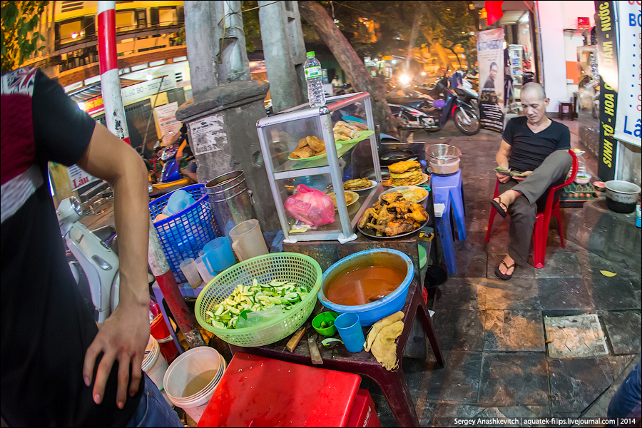 А теперь поговорим об уличных забегаловках. У нас бы их закрыли моментально, но не во Вьетнаме. Здесь всем совершенно наплевать на то, в каких условиях готовится еда и в каких условиях ее придется есть. Здесь главное, чтобы все это происходило на как можно более людной улице. Есть прямо на улице для вьетнамцем что-то вроде фетиша. В своих домах они практически не едят, норовят обязательно выйти со своим супом фо или миской рисовой лапши на людную улицу. И уже там уплетают еду за обе щеки, глазея по сторонам и переговариваясь со знакомыми и совершенно посторонними людьми. Поэтому уличные заведения в этой стране процветают - вечером в них, как правило, яблоку негде упасть. Несмотря на всю грязь и треш.