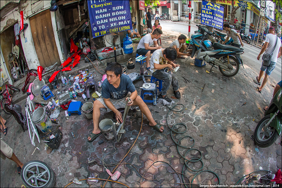 Ханойские улицы полны не только торговцев, но и разного рода ремесленников. Здесь можно встретить кого угодно - от обувщиков до фрезеровщиков с выставленными на улицу станками, от мастеров уличного массажа до резчиков по камню, изготавливающих надгробные таблички.
