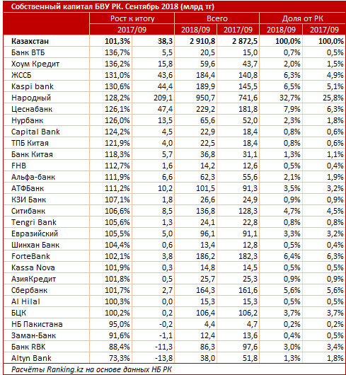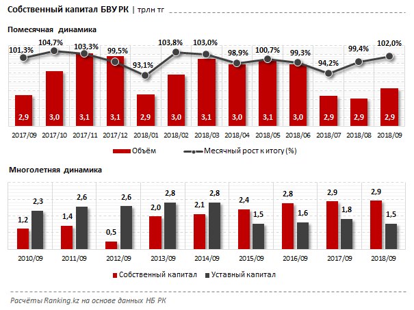 За сентябрь совокупный собственный капитал банков РК вырос на 2 процента и составил на конец месяца 2,9 триллиона тенге. Ранее три месяца подряд наблюдалось сокращение. Годовой рост составил 1,3 процента. При этом в 2017 году в аналогичном периоде годовой рост достигал 3,9 процента, а в 2016 году - сразу 15,7 процента.