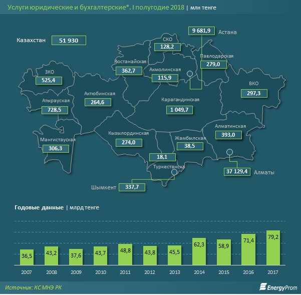 Наибольший объем услуг пришелся на финцентр - Алматы (сразу 71,5 процента от РК против 69,8 процента годом ранее). Еще 18,6 процента обеспечили бухгалтеры и юристы столицы (против 17,2 процента в аналогичном периоде прошлого года).