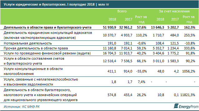 Объем услуг в секторе вырос год-к-году на 58 процентов. По итогам полугодия казахстанцам оказали услуги в сфере бухгалтерии и юриспруденции на 51,9 миллиарда тенге - это на 57,6 процента больше, чем годом ранее.