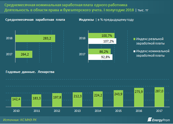 Среднемесячные заработные платы в области права и бухгалтерского учета по итогам первого полугодия составляли сразу 283,2 тысячи тенге - на 7,2 процента больше, чем годом ранее. С учетом инфляции, покупательная способность заработных плат в секторе выросла на 0,7 процента.
