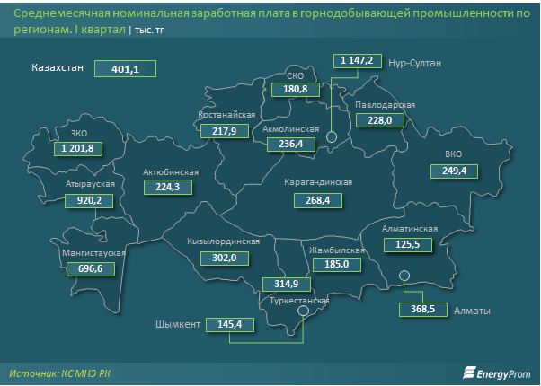 Самые большие зарплаты в высокооплачиваемой сфере горной добычи и разработки карьеров зафиксированы в ЗКО. Здесь в первом квартале 2019 года среднемесячная номинальная зарплата составила 1,2 миллиона тенге (рост за год - на 11,7 процента), что в 7,1 раза выше зарплаты среднего работника в РК.