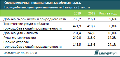 В горнодобывающей отрасли наибольшую среднемесячную номинальную зарплату получают занятые в сфере добычи сырой нефти и природного газа: 785,2 тысячи тенге, это в 4,7 раза больше среднереспубликанского уровня (168,5 тысячи тенге) и в 3,2 раза - чем в среднем у работников промышленности.
