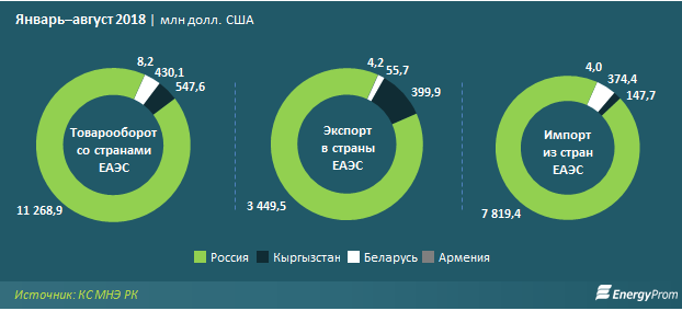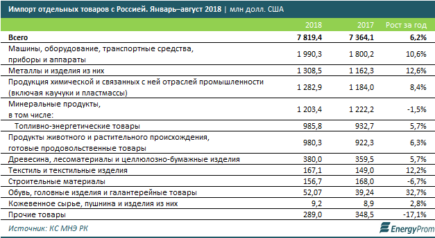 Из Российской Федерации - главного партнера страны по товарообороту, и в особенности по импорту - в Казахстан за 8 месяцев завезли продукции сразу на 7,8 миллиарда долларов, что на 6,2 процента больше, чем в аналогичном периоде 2017 года.
