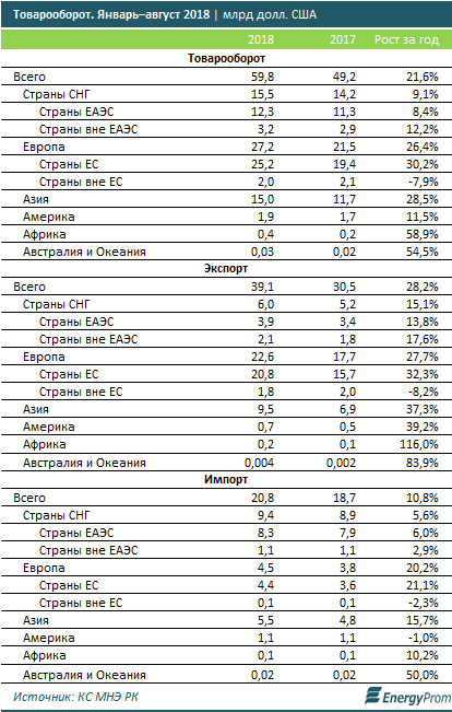 В целом по итогам 8 месяцев объем внешнеторгового оборота Казахстана составил 59,8 миллиарда долларов - на 21,6 процента больше, чем в аналогичном периоде годом ранее. Вырос как экспорт (+28,2 процента), так и импорт (+10,8 процента).