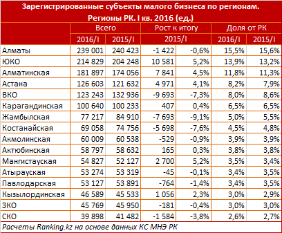 В основном малый бизнес расположен в южных регионах (41,2 процента субъектов малого предпринимательства от общего числа по стране). Больше всего предприятий насчитывается в Алматы (239 тысяч), на втором месте ЮКО (214 тысяч), на третьем - Алматинская область (181 тысяча). Наименьшее развитие малое предпринимательство получило в аграрных Кызылординской области (46,5 тысячи субъектов) и СКО (39,8 тысячи) и нефтегазовой ЗКО (45,7 тысячи). За год по Казахстану количество зарегистрированных малых компаний увеличилось в 7 регионах.