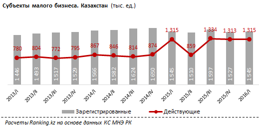 По состоянию на первый квартал 2016 года, количество зарегистрированных субъектов малого предпринимательства в стране составило более 1,5 миллиона. Из них активными являлись 1,3 миллиона предприятий. Сообщается, что индивидуальные предприниматели в Казахстане являются самыми активными участниками бизнес-среды. В первом квартале 2016 доля индивидуальных предпринимателей от общего числа субъектов малого бизнеса составила 68,2 процента. На юридические лица приходится 19,6 процента, крестьянские (фермерские) хозяйства насчитывают 12,2 процента.