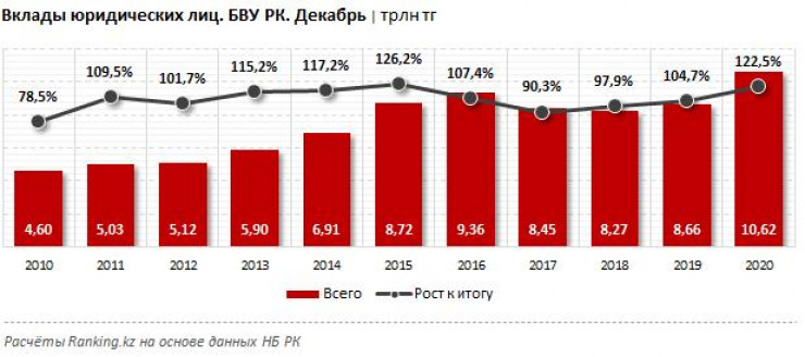 В общем по банковскому сектору портфель корпоративных депозитов растет второй год подряд. Так, к началу прошлого года показатель составлял 8,66 триллиона тенге, при годовом росте к 2019 году на 4,7 процента.