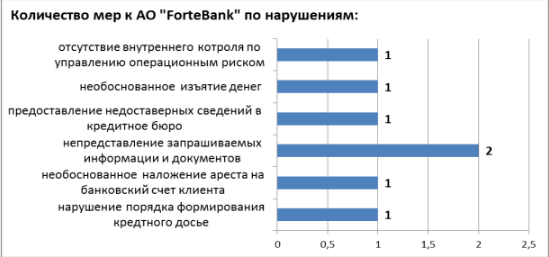 Также сообщается, что доля принятых мер в отношении АО "ForteBank" составляет 11 процентов, банку вынесено 6 письменных предписаний за указанные нарушения и 1 письменное предупреждение за необоснованное наложение ареста на банковский счет клиента.