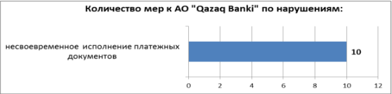 Основным нарушением АО "Qazaq Banki" стало несвоевременное исполнение платежных документов. За указанное нарушение предусмотрена административная ответственность в виде штрафа в размере 5 процентов от суммы платежного документа, но не более 200 МРП.