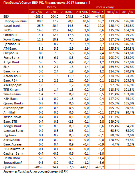 Примечательно, что на конец июня совокупная прибыль составляла 204 миллиарда тенге. В 2012 году банковский сектор уходил в минус на 1,3 триллиона тенге. В июле 2016 года прибыль БВУ РК составила 243,8 миллиарда тенге - самый высокий показатель прибыли за январь-июль после 2010 года.