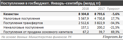 Одной из причин стало снижение трансфертов из Нацфонда сразу на 1,3 триллиона тенге. В целом доходы госбюджета за январь-сентябрь текущего года составили 8,3 триллиона тенге: наблюдается снижение на 5,6 процента год-к-году.