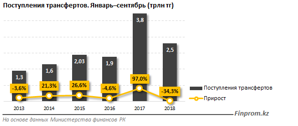Максимальное значение поступлений трансфертов по итогам 9 месяцев наблюдалось в 2017 году - 3,8 триллиона тенге, что превышало на 97 процентов показатели 2016-го (1,9 триллиона тенге). Причиной такого резкого скачка явились указы Президента РК о выделении целевого трансферта для оздоровления банковского сектора на сумму 1,1 триллиона тенге, а также выделение 441,6 миллиарда тенге на другие цели.