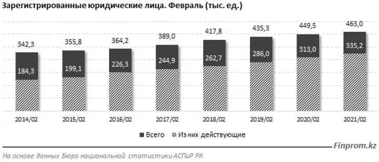 Отметим, что за минувший год число предприятий в Казахстане выросло на 3 процента и достигло 463 тысяч юридических лиц. В то же время число действующих выросло на 7,1 процента и составило 335,2 тысячи компаний.