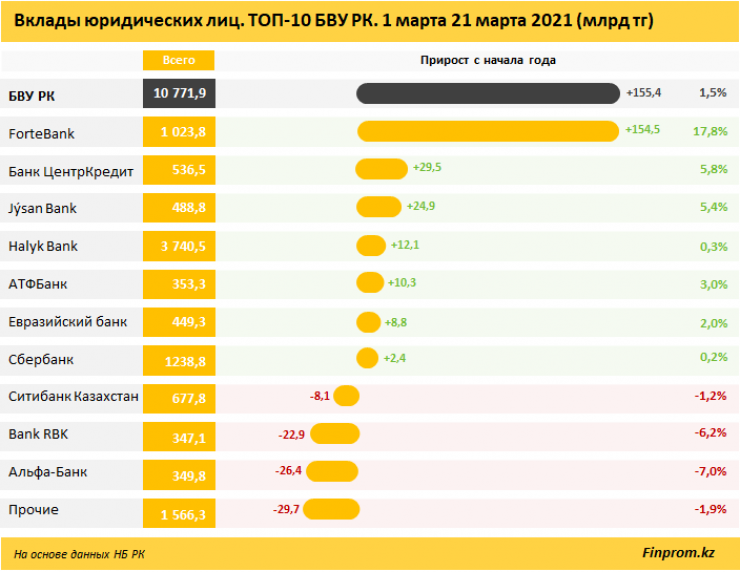 Абсолютный лидер роста как в месячном измерении, так и на отрезке первых трех месяцев - ForteBank. Нарастив портфель на 154,5 миллиарда тенге, банк впервые продемонстрировал показатель свыше 1 триллиона тенге. Недавняя номинация на “Лучший банк Казахстана” по версии Global Finance только укрепила положение фининститута в тройке крупнейших бизнес-партнеров для казахстанского бизнеса. На момент мартовского спада деловой активности ForteBank смог показать рост на 72,9 миллиарда тенге по корпоративным вкладам.