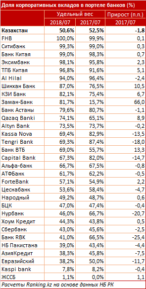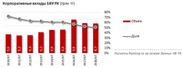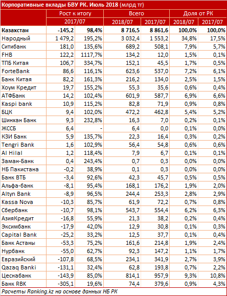 Объем корпоративных вкладов в банках на конец июля 2018 года составил 8,7 триллиона тенге, что на 145,2 миллиарда (1,6 процента) меньше, чем в прошлом году. Об этом сообщается в исследовании, передает Tengrinews.kz со ссылкой на Ranking.kz.