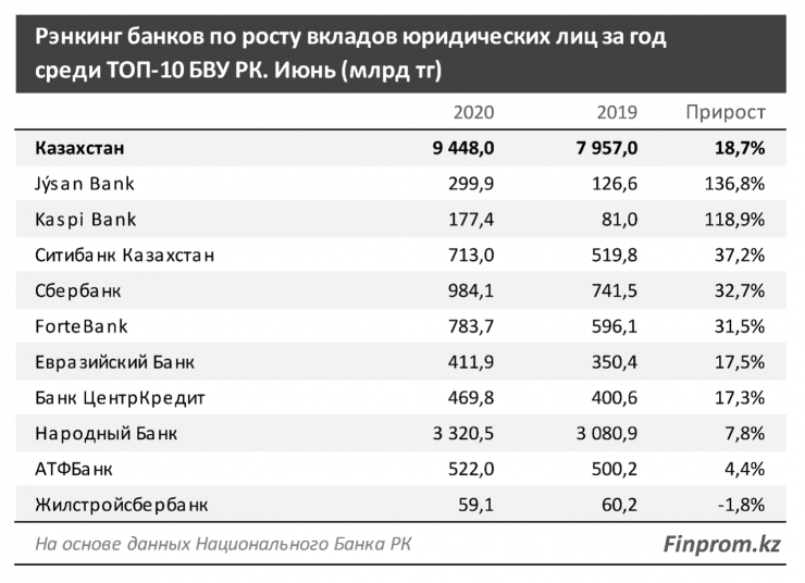 Наибольший рост вкладов юридических лиц среди крупнейших БВУ РК наблюдается у Jýsan Bank: за год сумма выросла более чем в 2,3 раза, до 299,9 миллиарда тенге (годом ранее — 126,6 миллиарда тенге). В денежном выражении сумма увеличилась сразу на 173,3 миллиарда тенге.