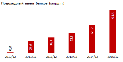Динамика уровня доходов, связанных с получением вознаграждения, обусловила и рост подоходного налога банков. В 2015 году сумма налога составила 94,5 миллиарда тенге против 61,2 миллиарда годом ранее.