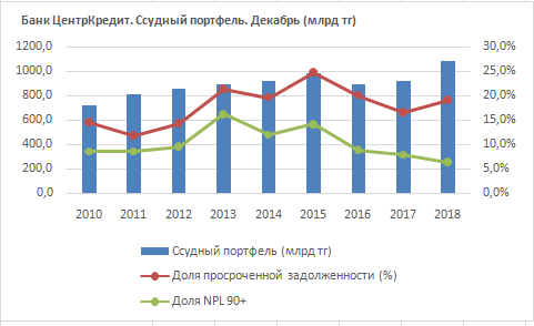 Банк ЦентрКредит, также вошедший в лидеры месячного прироста ссудного портфеля, показывает улучшение качества ссудного портфеля за счет сокращения веса наиболее токсичных кредитов NPL 90+ с 7,9 до 6,4 процента от портфеля за год. В то же время доля просроченных кредитов в целом составила 19,1 процента от портфеля займов банка, против 16,7 процента годом ранее. Сам ссудный портфель банка за год вырос на 17,7 процента.