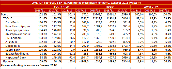 Также в тройку лидеров по приросту в первой десятке вошли Банк ЦентрКредит (+5 процентов за декабрь) и Банк Хоум Кредит (+4,4 процента). Всего из десяти самых крупных БВУ-кредиторов в РК рост портфеля за месяц показали восемь банков, за год - девять.