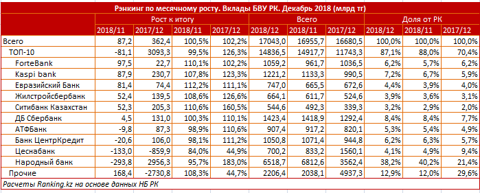 К началу текущего года объем банковских вкладов показал месячный рост на 87,2 миллиарда тенге (0,5 процента) и достиг 17 триллионов тенге. За год депозитная база выросла на 362,4 миллиарда тенге (2,2 процента).