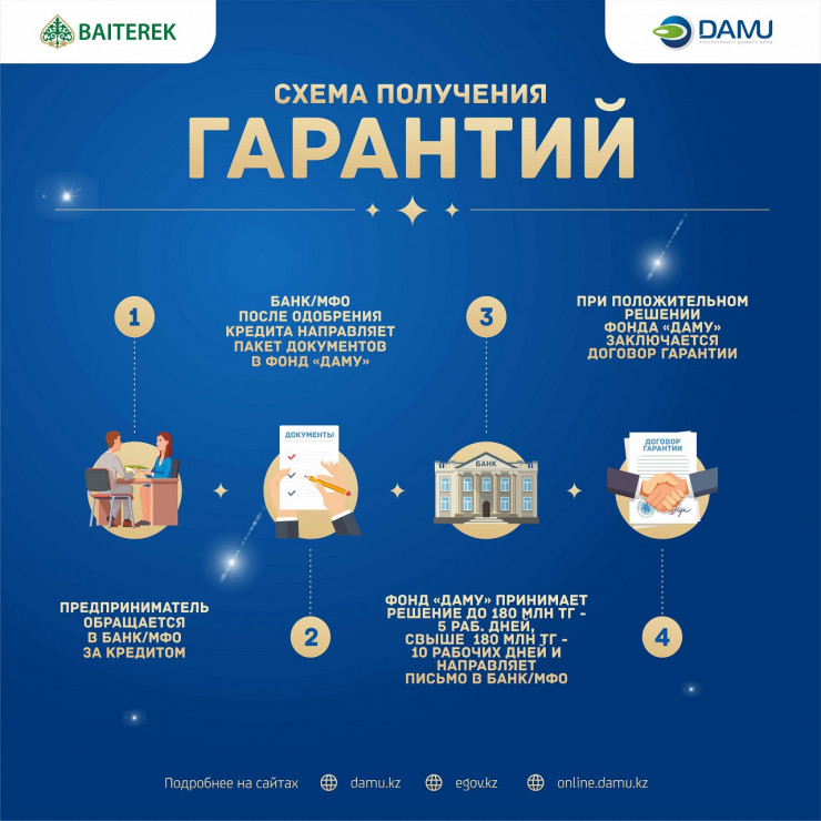 Предприниматели, желающие получить гарантии от фонда "Даму", могут направлять свои заявки online через порталы egov.kz и online.damu.kz, а также могут получить консультации в режиме online на сайтах damu.kz, online.damu.kz или позвонив в единый Call-center 1408 (звонок бесплатный). Можно также связаться напрямую с менеджерами в регионах, контактная информация размещена на сайте и в официальных аккаунтах фонда в социальных сетях.