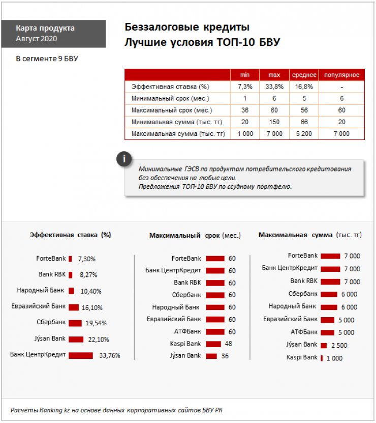 Потребительские займы на любые цели без залога предлагают 17 банков из 27 БВУ РК. При этом из крупнейшей десятки банков-кредиторов страны продукт предлагают 9 БВУ со средней ГЭСВ в сегменте 16,8 процента.