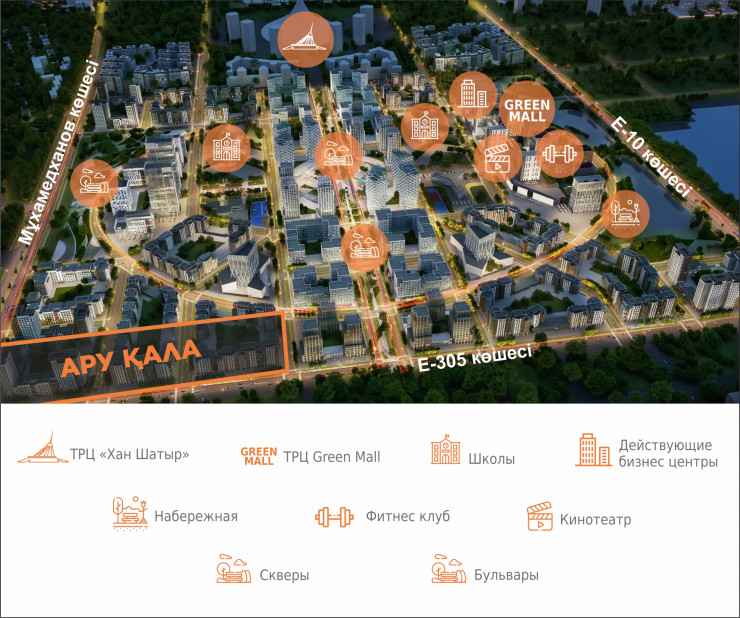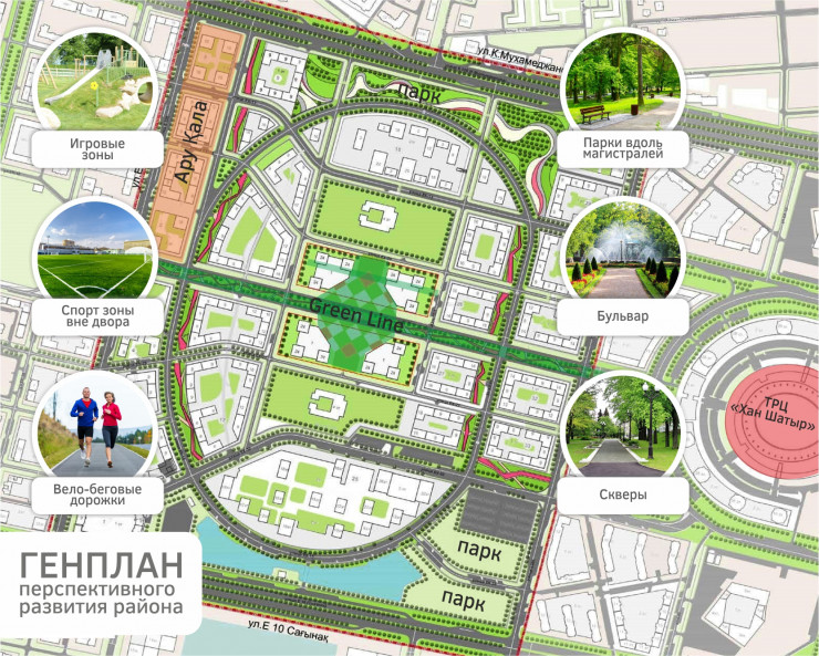 Новый район, расположенный за ТРЦ "Хан Шатыр", в квадрате улиц Кайыма Мухамедханова, Е-305, Е-10 и проспекта Туран, неслучайно назвали Green Line. Площадь озеленения составит 219 тысяч метров. Фактически это целый экополис, где будет построено 12 000 квартир, две школы и две парковые зоны, проложены 10 километров велодорожек, предусмотрены уютные зоны отдыха и аллеи. По факту он уже активно осваивается. Здесь расположены головные офисы крупнейших компаний страны – ФНБ "Самрук-Казына", НАК "Казатомпром". Реализован проект "Зеленый квартал" с искусственным прудом, BI City Seoul, построены 2 очереди BI City Tokyo и другие комплексы.
