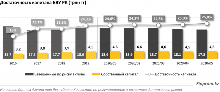 Сейчас банки РК имеют существенный запас ликвидности, составляющий около 13 триллионов тенге, из них 10 триллионов тенге приходится на высоколиквидные активы, это 38,4% от общей суммы активов. Такой объем свободной ликвидности позволяет банкам обслуживать свои обязательства в полном размере. Кроме того, банки второго уровня имеют значительный запас в виде собственного капитала, что также отражает финансовую стабильность и способность ответить по своим обязательствам. По состоянию на 1 июня 2020 года достаточность собственного капитала увеличилась до 25,8%. В целом регуляторный собственный капитал БВУ РК сложился на уровне 4,6 триллиона тенге.