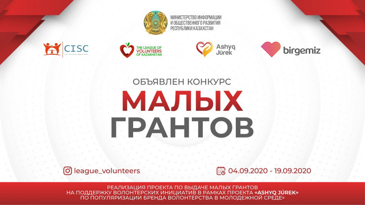 Открыт конкурс малых грантов, направленных на поддержку индивидуальных усилий граждан (добровольная миссия) и волонтерских инициатив в решении конкретных локальных задач в сфере волонтерства в рамках общенационального проекта "Ашық жүрек". Конкурс проводится с 4 сентября 2020 года по 19 сентября 2020 года.