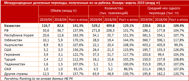 В целом казахстанцы получили из-за рубежа всего за четыре месяца почти 117 миллиардов тенге. Общий объем также вырос на 41,3 процента. Было сделано 529,2 тысячи транзакций. Средний чек одной транзакции через международные системы денежных переводов за год вырос с 201,6 тысячи до 220,6 тысячи тенге.