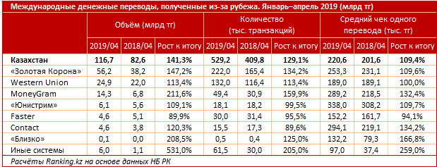 Среди систем денежных переводов по объему транзакций лидирует "Золотая Корона": 56,2 миллиарда тенге, что составляет чуть менее половины от всего объема полученных средств за январь-апрель 2019 года, рост за год - на 47,2 процента. Средний чек одного перевода в РК через систему вырос с 231,1 до 253,3 тысячи тенге.