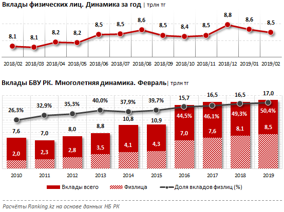 Розничные вклады в отрицательной зоне роста второй месяц подряд. Так, к весне их объем составил всего 8,54 триллиона тенге против 8,63 триллиона тенге месяцем ранее, и 8,77 триллиона тенге - в начале текущего года.