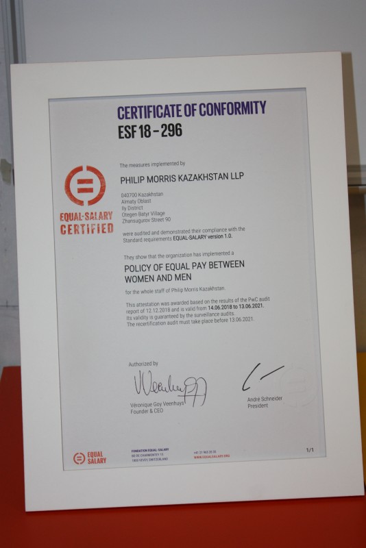 Во всем мире все чаще ведущие компании становятся приверженцами равной оплаты труда для все всех своих сотрудников вне зависимости от их пола. Так, недавно компания ТОО "Филип Моррис Казахстан" стала первой в Казахстане компанией, получившей подтверждение того, что компания применяет одинаковые условия оплаты труда в отношении мужчин и женщин, а также что их профессиональный вклад ценится одинаково, вне зависимости от их пола, посредством сертификации некоммерческого фонда EQUAL-SALARY, Швейцария.