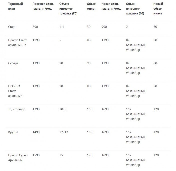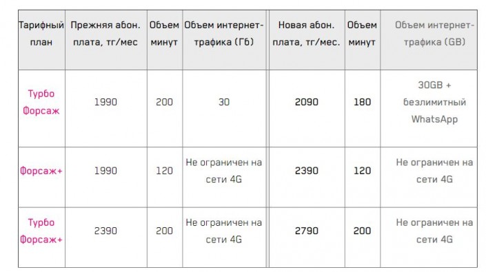"Основные изменения условий тарифных планов коснутся ежемесячной абонентской платы и количества минут на другие сети РК, предоставляемые при удержании абонентской платы. Все прочие условия остаются без изменений. В случае если абонентская плата на данных тарифных планах удержана до 24 апреля 2018 года, новые условия вступят в силу через 30 календарных дней, после окончания срока действия абонентской платы", - сообщается на сайтах объединенной компании.