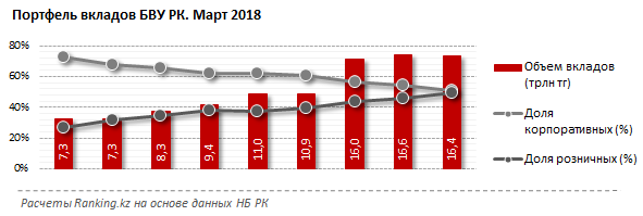 По данным аналитиков, совокупный объем депозитов БВУ РК за год, к концу марта 2018 года, уменьшился на 1,1 процента (минус 177,8 миллиарда тенге) и составил 16,4 триллиона тенге. Годом ранее объем депозитного портфеля показывал рост на 4 процента.