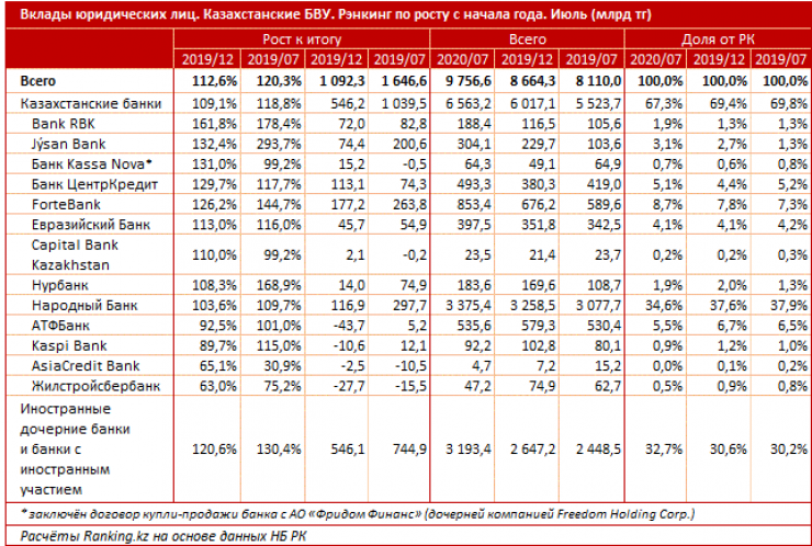 По итогам июля текущего года Bank RBK продемонстрировал наиболее высокие темпы роста депозитов юридических лиц среди казахстанских банков, следует из аналитического отчета агентства Ranking.kz.