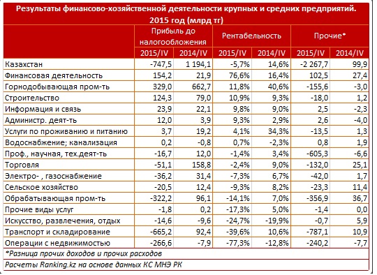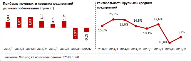 Однако после учета всех остальных, непроизводственных доходов и расходов, крупные и средние предприятия на конец года показали убыток до налогообложения в размере 750 миллиардов тенге. А их рентабельность снизилась до минус 5,7 процента против плюсовых 14,6 в 2014 году.