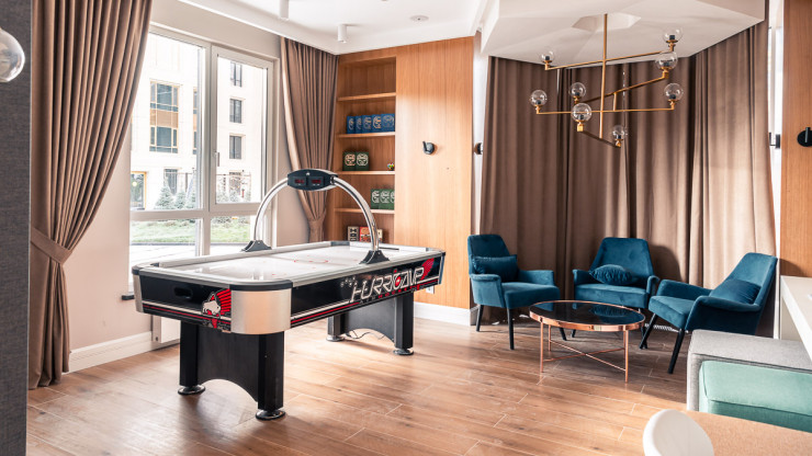 В обоих блоках будут консьержи, предусмотрена зона ожидания для гостей. Местом общения и уютного отдыха резидентов станет зона коворкинга, где можно почитать книги или организовать досуг за настольными играми. Стоит отметить, что коворкинг находится в высотке, на третьем этаже.